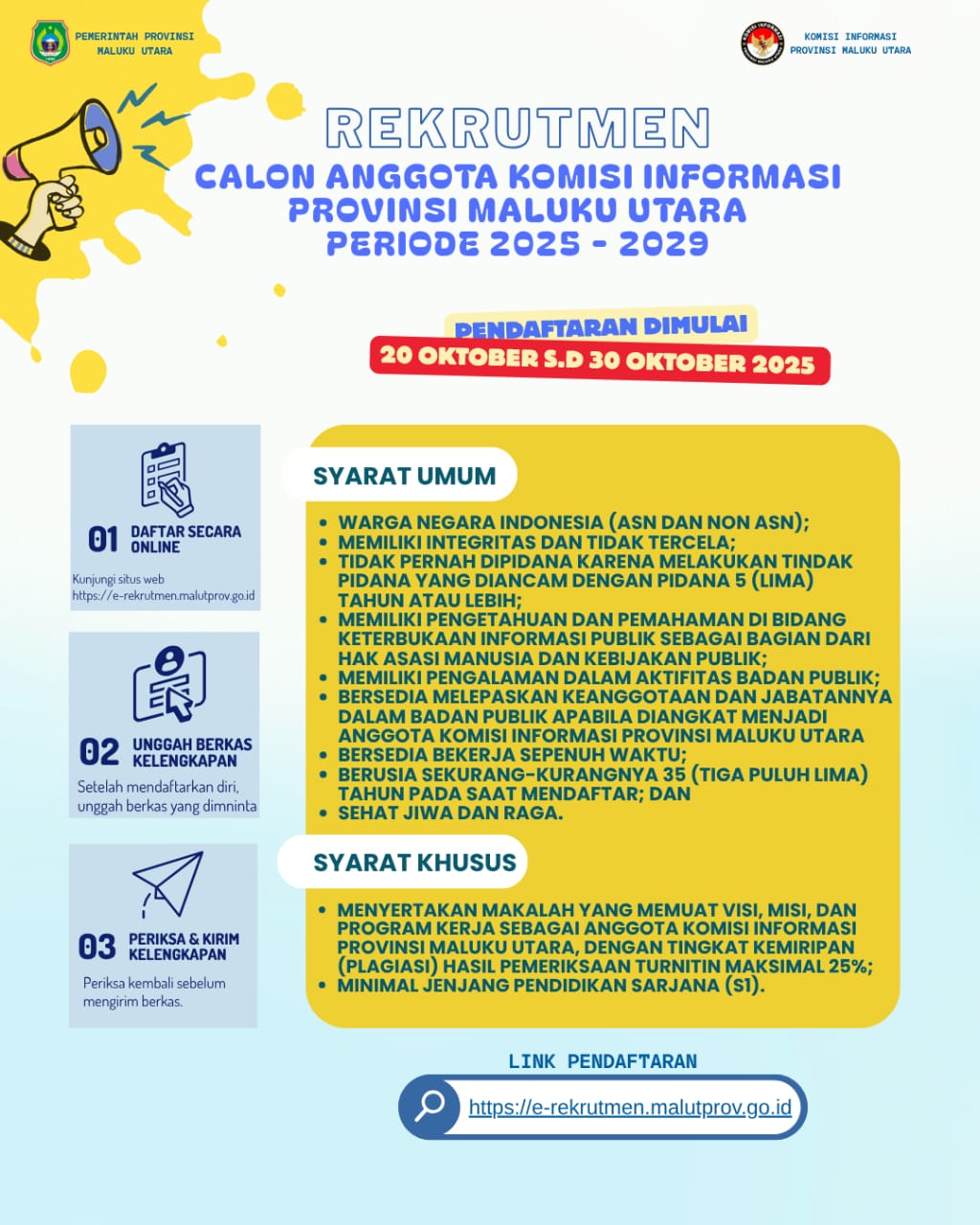 SOFIFI – Pemerintah Provinsi Maluku Utara melalui Dinas Komunikasi, Informatika dan Persandian (Diskominfosan) resmi membuka pendaftaran rekrutmen calon anggota Komisi Informasi Provinsi periode 2025–2029.