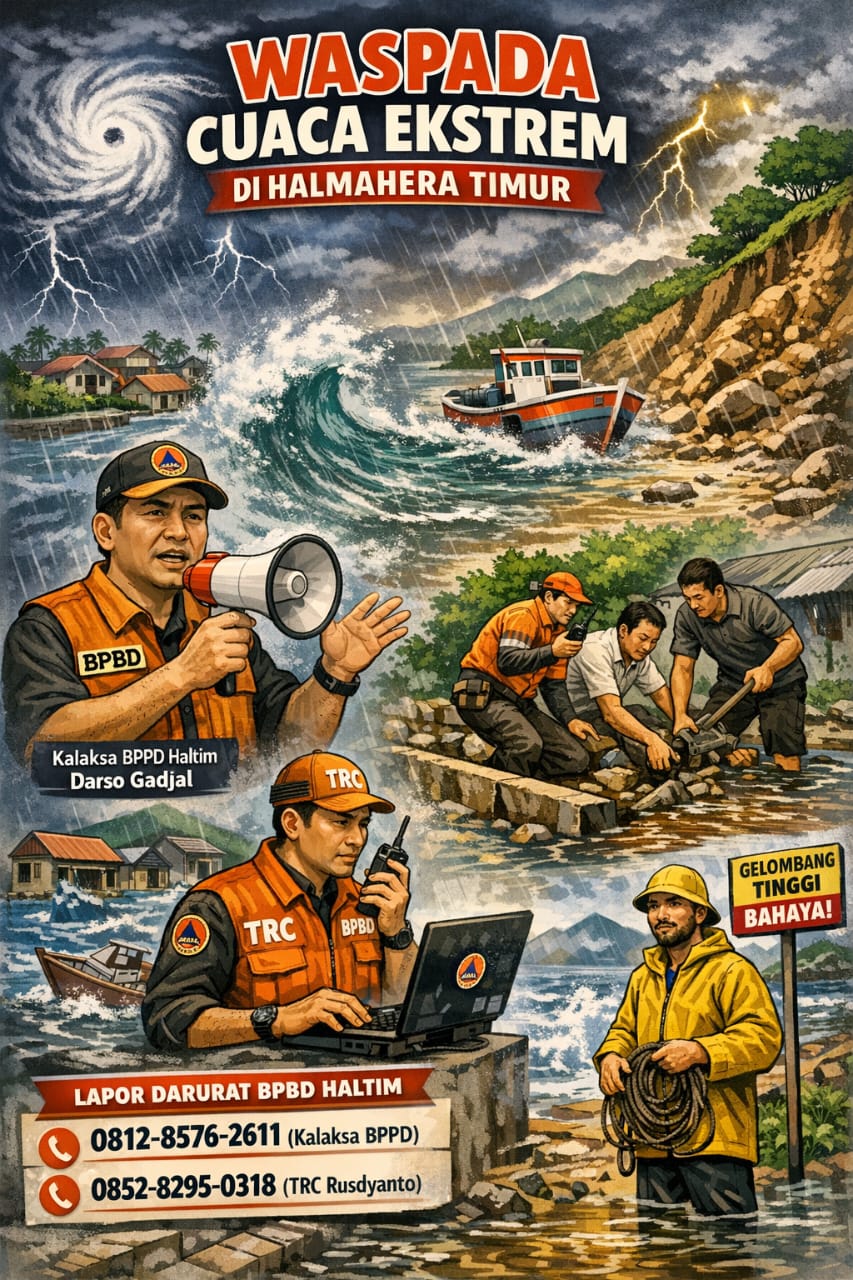 HALTIM – Badan Penanggulangan Bencana Daerah (BPBD) Kabupaten Halmahera Timur (Haltim) mengeluarkan peringatan dini kepada seluruh masyarakat agar meningkatkan kewaspadaan terhadap potensi cuaca ekstrem dalam beberapa hari ke depan.