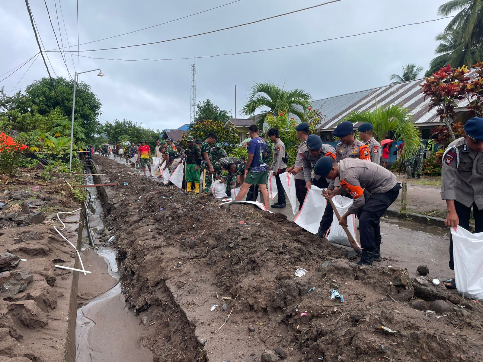 Melihat situasi tersebut, personel Polri bersama tim gabungan dan warga setempat segera melakukan langkah preventif secara manual. Dengan peralatan terbatas, anggota kepolisian terlihat memanggul karung berisi pasir untuk menyusun tanggul darurat guna menahan dan mengalihkan arus air agar tidak masuk ke rumah warga.