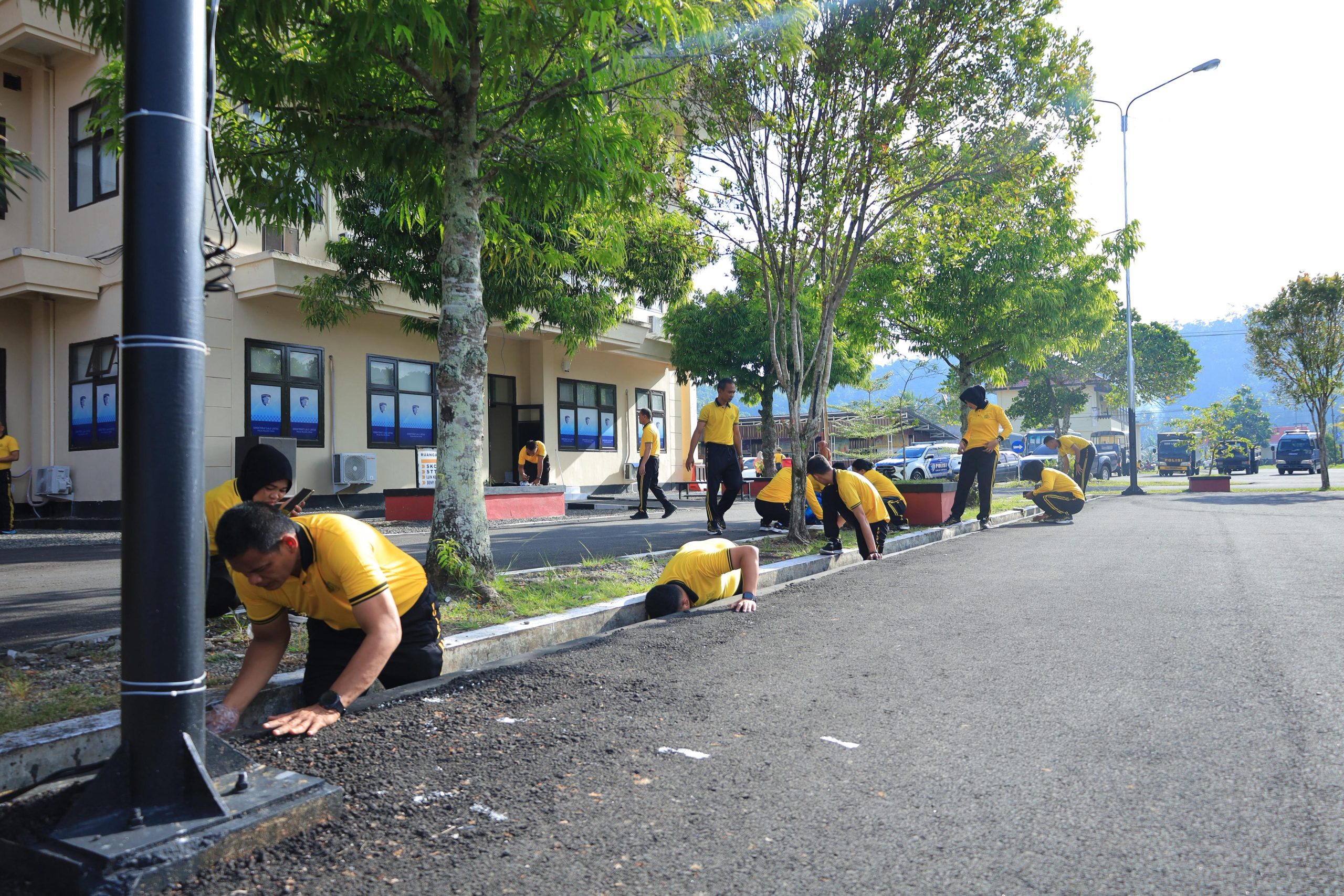 Usai apel, seluruh personel Polda Maluku Utara melaksanakan kegiatan pembersihan secara menyeluruh di lingkungan Mako, meliputi halaman, perkantoran, fasilitas umum, hingga area sekitar.