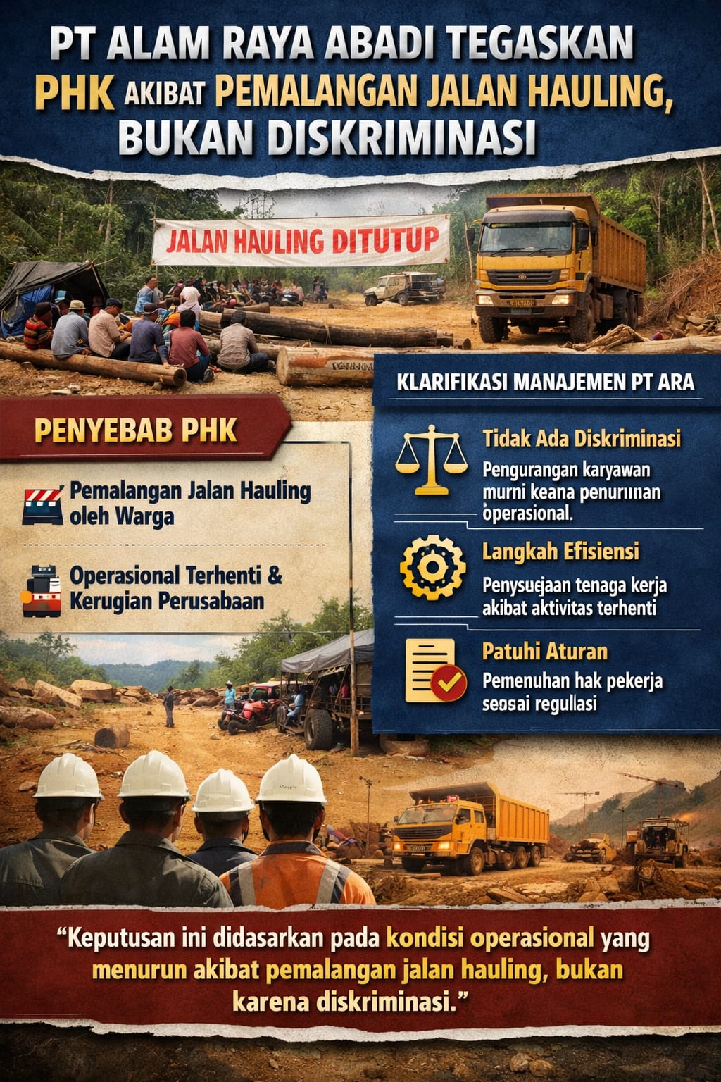 Dalam keterangan tertulis yang diterima redaksi, pihak perusahaan menegaskan bahwa kebijakan merumahkan sebagian karyawan merupakan dampak langsung dari terhentinya operasional akibat pemalangan jalan hauling oleh warga.