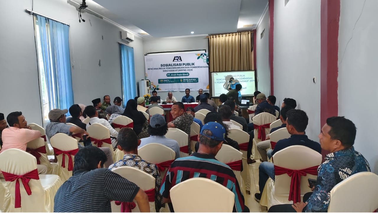 HALTIM—PT Alam Raya Abadi (ARA) menggelar Sosialisasi Publik Rencana Induk Pengembangan dan Pemberdayaan Masyarakat (RIPPM) tahun 2026–2027 di Hotel Kartika, Buli, Kabupaten Halmahera Timur, Sabtu (7/3/2026).