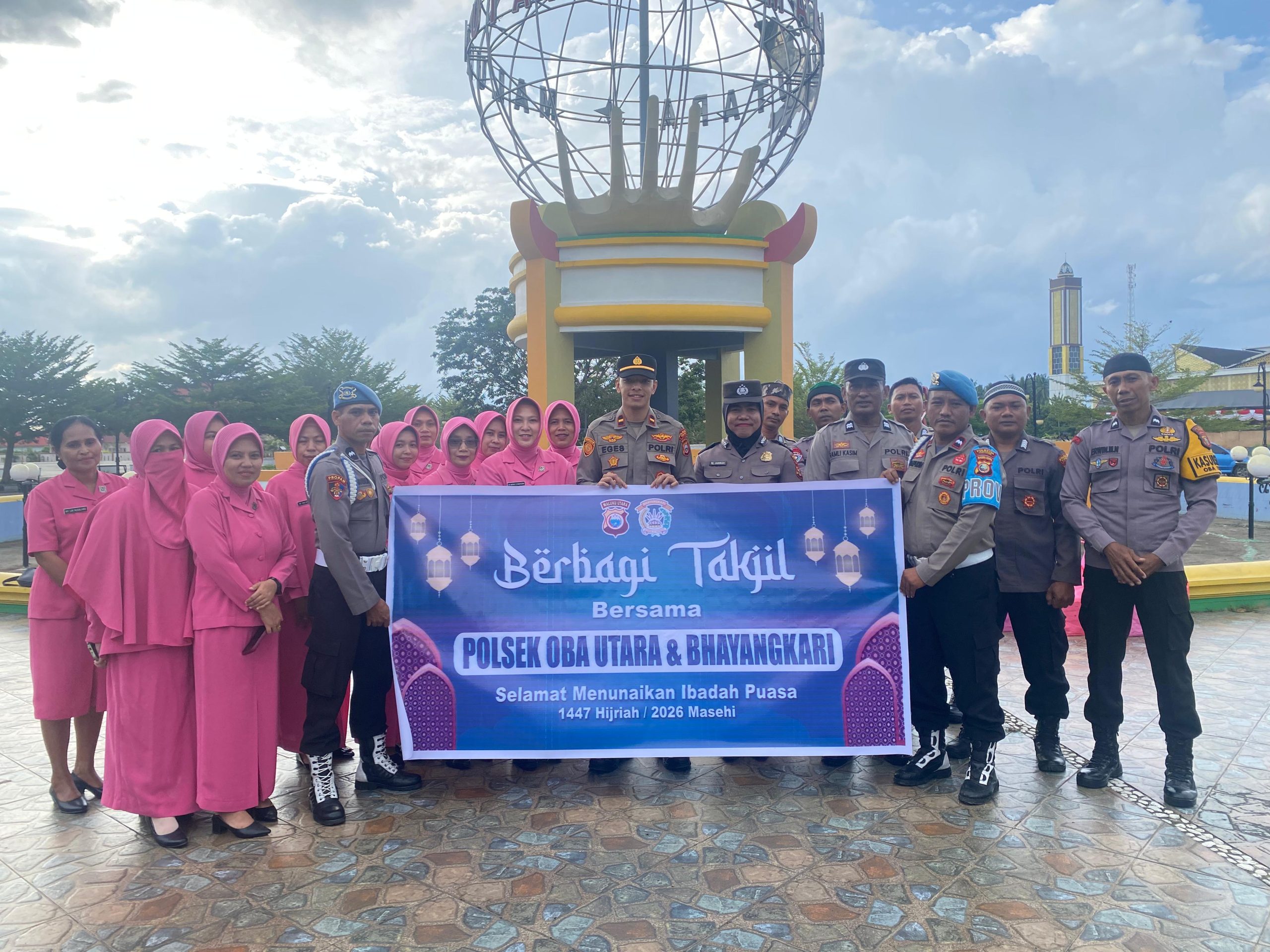 Dalam rangka meningkatkan kepedulian sosial di bulan suci Ramadhan 1447 H, jajaran Polsek Oba Utara dan Bhyangkari melaksanakan kegiatan pembagian takjil kepada masyarakat dan para pengguna jalan di wilayah Kecamatan Oba Utara, Kota Tidore Kepulauan.selasa (10/3/26) dibundaran kilometer jalan 40 disofifi.