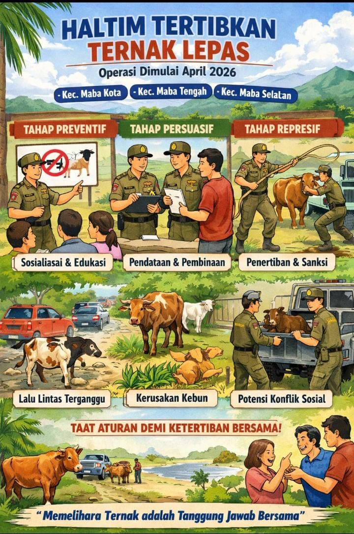 HALTIM – Pemerintah Kabupaten Halmahera Timur melalui Satuan Polisi Pamong Praja dan Pemadam Kebakaran akan melaksanakan operasi penertiban hewan ternak yang dilepas bebas di wilayah Zona Maba.