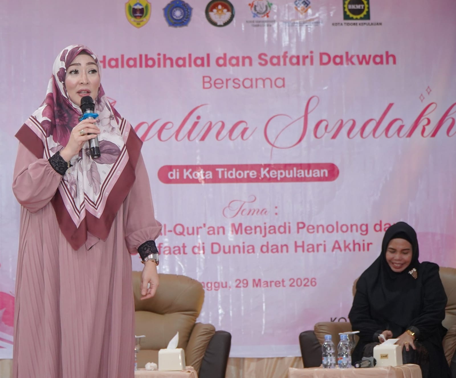 Tidore- Halalbihalal dirangkaikan dengan Safari Dakwah yang menghadirkan penceramah Angelina Sondakh menuai antusias yang sangat luar biasa bagi masyarakat dan majelis taklim di Kota Tidore Kepulauan untuk mengikuti safari dakwah dengan mengusung tema “ Ketika Al-Qur’an Menjadi Penolong dan Syafaat di Dunia dan Hari Akhir”, yang berlangsung di Aula Sultan Nuku, Kantor Wali Kota Tidore, Minggu (29/3/2026).