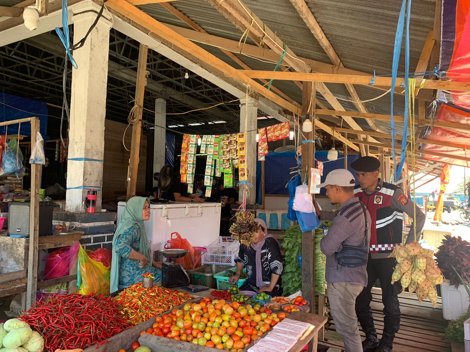 HALTIM – Personel Polres Halmahera Timur bersama Dinas Perindustrian, Perdagangan, dan Koperasi (Disperindagkop) melakukan pemantauan harga dan stok sembako di sejumlah pasar rakyat di Kabupaten Halmahera Timur, Selasa (21/04/2026).