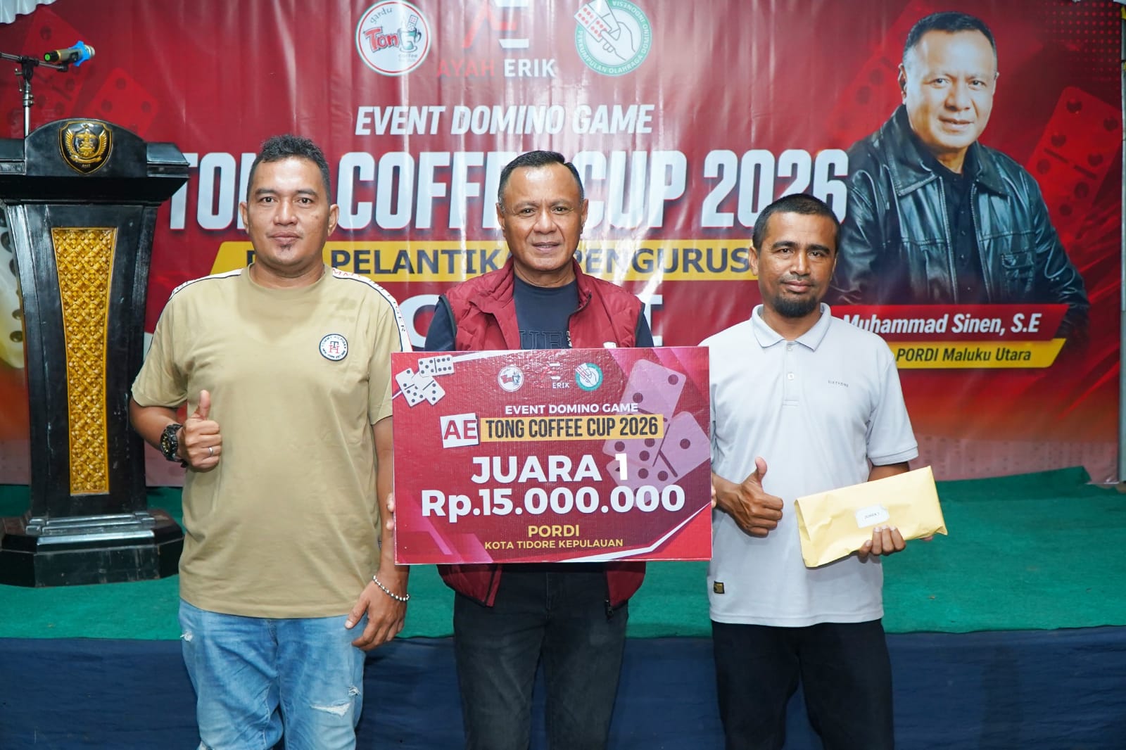 Tidore- Event Domino Game AE Tong Coffee Cup 2026 resmi berakhir, ditutup langsung oleh Wali Kota Tidore Kepulauan Muhammad Sinen yang juga selaku Ketua Pordi Provinsi Maluku Utara, hadir dalam kegiatan tersebut Forkopimda dan OPD Kota Tidore Kepulauan, berlangsung 3 malam, kegiatan tersebut bertempat di depan Tong Coffee, Kelurahan Tuguwaji, Minggu (26/4/2026) Malam.